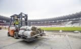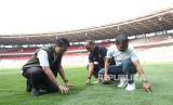 Pusat Pengelolaan Komplek Gelanggang Olahraga Bung Karno (PPKGBK) memasang rumput untuk persiapan pertandingan Ronde 3 Kualifikasi Piala Dunia 2026 antara Indonesia melawan Australia.