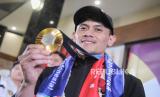 Atlet panjat tebing Indonesia Veddriq Leonardo berpose menunjukan medali emas Olimpiade Paris 2024 saat tiba di Bandara Soekarno Hatta, Tangerang, Banten, Selasa (13/8/2024). Rombongan atlet Indonesia bersama peraih medali emas Veddriq Leonardo dan Rizki Juniansyah tiba di bandara sekitar pukul 22.43 WIB disambut tepuk tangan dari keluarga dan kerabat. (FOTO : Republika/Thoudy Badai)