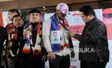 Atlet angkat besi Indonesia Rizki Juniansyah (kedua kanan) bersama International Olympic Committee (IOC) Erick Thohir (kanan) berfoto bersama saat tiba di Bandara Soekarno Hatta, Tangerang, Banten, Selasa (13/8/2024). Rombongan atlet Indonesia yang berlaga pada gelaran Olimpiade Paris 2024 bersama peraih medali emas Veddriq Leonardo dan Rizki Juniansyah tiba di bandara sekitar pukul 22.43 WIB disambut tepuk tangan dari keluarga dan kerabat. (FOTO : Republika/Thoudy Badai)