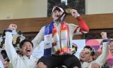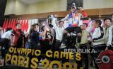 Atlet angkat besi Rizki Juniansyah melakukan selebrasi saat tiba di Bandara Soekarno Hatta, Tangerang, Banten, Selasa (13/8/2024). Rombongan atlet Indonesia bersama peraih medali emas Veddriq Leonardo dan Rizki Juniansyah tiba di bandara sekitar pukul 22.43 WIB disambut tepuk tangan dari keluarga dan kerabat. Tim Indonesia berhasil meraih dua medali emas dari cabang olahraga panjat tebing putra Veddriq Leonardo dan angkat besi putra Rizki Juniansyah serta medali perunggu cabang olahraga bulutangkis tunggal putri Gregoria Mariska Tunjung. (FOTO : Republika/Thoudy Badai)