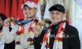 Atlet panjat tebing Indonesia Veddriq Leonardo bersama atlet angkat besi Rizki Juniansyah berpose menunjukan medali emas Olimpiade Paris 2024 saat tiba di Bandara Soekarno Hatta, Tangerang, Banten, Selasa (13/8/2024). Rombongan atlet Indonesia bersama peraih medali emas Veddriq Leonardo dan Rizki Juniansyah tiba di bandara sekitar pukul 22.43 WIB disambut tepuk tangan dari keluarga dan kerabat. Tim Indonesia berhasil meraih dua medali emas dari cabang olahraga panjat tebing putra Veddriq Leonardo dan angkat besi putra Rizki Juniansyah serta medali perunggu cabang olahraga bulutangkis tunggal putri Gregoria Mariska Tunjung. (FOTO : Republika/Thoudy Badai)