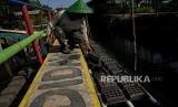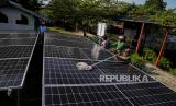 Anggota kelompok pembudidaya ikan Program Masyarakat Mandiri Kutawaru (Mamaku) PT Kilang Pertamina Internasional (KPI) Unit Cilacap, membersihkan panel pembangkit listrik tenaga surya, di kawasan wisata terpadu Kampoeng Kepiting Kelurahan Kutawaru, Cilacap, Jawa Tengah, Selasa (13/8/2024). Kawasan wisata Kampoeng Kepiting menggunakan pembangkit listrik tenaga surya berkapasitas 6.400 Watt Peak, untuk kebutuhan penerangan wilayah, mesin pendingin dan aerator air tambak, sebagai program terpadu Masyarakat Mandiri Kutawaru (Mamaku) PT KPI Unit Cilacap. (FOTO : ANTARA FOTO/Idhad Zakaria)