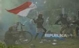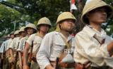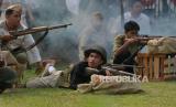 Seniman dari komunitas Reenactor Bangor Indonesia menampilkan teatrikal sosiodrama di halaman Museum Perumusan Naskah Proklamasi, Menteng, Jakarta Pusat, Jumat (16/8/2024). Sosiodrama berjudul Pusaka Indonesia tersebut menceritakan fragmen perjalanan Kemerdekaan Indonesia dari zaman kolonial Belanda, pendudukan Jepang, masuknya sekutu, perumusan naskah proklamasi, hingga konflik dengan sekutu pasca proklamasi kemerdekaan Indonesia. (FOTO : Republika/Thoudy Badai)