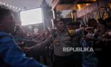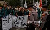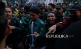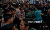 Petugas kepolisian berusaha melerai massa aksi aliansi Bada Eksekutif Mahasiswa Seluruh Indonesia (BEM SI) saat terjadi bentrokan ketika unjuk rasa di belakang Gedung DPR/MPR RI, Jakarta, Jumat (16/8/2024). Dalam aksinya, mereka menyampaikan aspirasinya terkait ketidakpuasan terhadap 10 tahun pemerintahan Presiden Joko Widodo. Aksi tersebut berlangsung hingga sore hari, sejumlah massa sempat saling dorong dengan aparat kepolisian saat massa aksi berusaha merangsek ke depan pintu gerbang DPR/MPR. Massa membubarkan diri setelah mendapatkan peringatan dari petugas kepolisian sekitar pukul 18.25 WIB. (FOTO : Republika/Thoudy Badai)