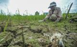 Petani membersihkan gulma di sekitar tanaman padi yang mengering akibat kemarau di persawahan Sejinjang, Jambi, Selasa (20/8/2024). Dinas Tanaman Pangan, Hortikultura dan Peternakan Provinsi Jambi mencatat, hingga Agustus tahun ini sedikitnya 10 ribu hektare lebih sawah di provinsi itu terdampak kemarau, dengan 3 ribu hektare lebih di antaranya telah mengalami kekeringan. (FOTO : ANTARA FOTO/Wahdi Septiawan)