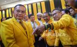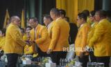 Ketua Dewan Pembina Partai Golkar Aburizal Bakrie berjabat tangan dengan Calon Ketua Umum Partai Golkar Bahlil Lahadalia saat menghadiri pembukaan munas XI Partai Golkar di Jakarta Convention Center, Jakarta, Selasa (20/8/2024). Partai Golkar menggelar Munas XI dengan agenda salah satunya yaitu pemilihan Ketua Umum DPP Partai Golkar Periode 2024-2029. (FOTO : Republika/Prayogi)
