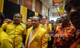 Ketua Pelaksana Rapimnas dan Munas XI Partai Golkar Bambang Soesatyo, Calon Ketua Umum Partai Golkar Bahlil Lahadalia dan Plt Ketua Umum Partai Golkar Agus Gumiwang Kartasasmita (dari kiri) saat menghadiri pembukaan munas XI Partai Golkar di Jakarta Convention Center, Jakarta, Selasa (20/8/2024). Partai Golkar menggelar Munas XI dengan agenda salah satunya yaitu pemilihan Ketua Umum DPP Partai Golkar Periode 2024-2029. (FOTO : Republika/Prayogi)