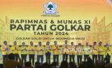 Plt Ketua Umum Partai Golkar Agus Gumiwang Kartasasmita bersama jajaran petinggi partai berfoto saat pembukaan munas XI Partai Golkar di Jakarta Convention Center, Jakarta, Selasa (20/8/2024). Partai Golkar menggelar Munas XI dengan agenda salah satunya yaitu pemilihan Ketua Umum DPP Partai Golkar Periode 2024-2029. (FOTO : Republika/Prayogi)
