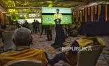 Kader partai golkar menyaksikan pidato Presiden Joko Widodo menyampaikan pidato dalam penutupan Musyawarah Nasional (Munas) XI Partai Golkar di Jakarta Convention Center (JCC), Senayan, Jakarta, Rabu (21/8/2024). Munas XI partai Golkar tersebut menyetujui dan menetapkan Bahlil Lahadalia sebagai Ketua Umum DPP Partai Golkar periode 2024-2029. (FOTO : Republika/Prayogi)