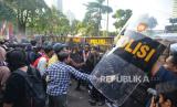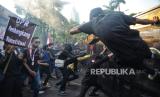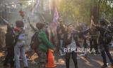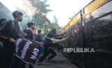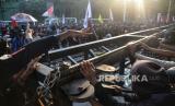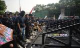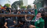 Sejumlah massa aksi terlibat bentrokan saat berunjuk rasa menolak pengesahan Revisi UU Pilkada di Gerbang Pancasila, Kompleks Parlemen, Senayan, Jakarta, Kamis (22/8/2024). Aksi menolak pengesahan revisi UU Pilkada itu diikuti mahasiswa dari berbagai universitas. (FOTO : Republika/Prayogi)