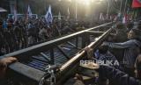 Massa aksi merobohkan pembatas di Gerbang Pancasila atau pintu belakang Gedung DPR, Senayan, Jakarta (22/8/2024). Massa aksi yang didominasi oleh mahasiswa itu menuntut DPR tak mengesahkan RUU Pilkada yang bertentangan dengan putusan MK. (FOTO : Republika/Bayu Adji P)