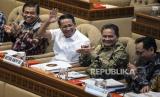 Menteri Hukum dan HAM Supratman Andi Agtas (kedua kiri), Ketua Dewan Kehormatan Penyelenggara Pemilu (DKPP) Heddy Lugito (kedua kanan), anggota DKPP I Dewa Kade Wiarsa Raka Sandi (kanan), dan pejabat Kemendagri Suhajar Diantoro (kiri) menyapa anggota DPR saat mengikuti rapat dengar pendapat (RDP) dengan Komisi II DPR tentang pentetapan revisi PKPU Nomor 8 tahun 2024 terkait keputusan Mahkamah Konstitusi di kompleks Parlemen, Senayan, Jakarta, Ahad (25/8/2024). Komisi II DPR bersama Kemenkumham, Kemendagri, KPU, Bawaslu, dan DKPP menyetujui Rancangan Peraturan Komisi Pemilihan Umum (R-PKPU) tentang perubahan atas PKPU Nomor 8 tahun 2024 tentang pencalonan gubernur dan wakil gubernur, bupati dan wakil bupati, serta wali kota dan wakil wali kota. (FOTO : ANTARA FOTO/Aprillio Akbar)