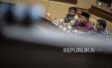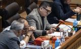 Ketua KPU Mochammad Afifuddin (tengah) didampingi anggota KPU Idham Holik (kiri) dan Plh Dirjen Polpum Kemendagri Togap Simangunsong (kanan) berbicara dalam rapat dengar pendapat (RDP) dengan Komisi II DPR tentang pentetapan revisi PKPU Nomor 8 tahun 2024 terkait keputusan Mahkamah Konstitusi di kompleks Parlemen, Senayan, Jakarta, Ahad (25/8/2024). Komisi II DPR bersama Kemenkumham, Kemendagri, KPU, Bawaslu, dan DKPP menyetujui Rancangan Peraturan Komisi Pemilihan Umum (R-PKPU) tentang perubahan atas PKPU Nomor 8 tahun 2024 tentang pencalonan gubernur dan wakil gubernur, bupati dan wakil bupati, serta wali kota dan wakil wali kota. (FOTO : ANTARA FOTO/Aprillio Akbar)