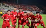 Pesepak bola Timnas Indonesia U-17 Evandra Florasta (ketiga kiri) berselebrasi bersama rekan setimnya Mochammad Mierza Firjatullah (kiri), Muhammad Aldyansyah Taher (kedua kiri), Zahaby Gholy (ketiga kanan), Daniel Alfrido (kedua kanan) dan Lucas Lee (kanan) usai mencetak gol ke gawang Timnas India U-17 saat pertandingan persahabatan internasional di Stadion Kapten I Wayan Dipta Gianyar, Bali, Ahad (25/8/2024). Timnas Indonesia U-17 mengalahkan Timnas India U-17 dengan skor 3-1. (FOTO : ANTARA FOTO/Fikri Yusuf)