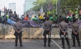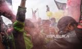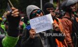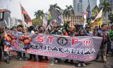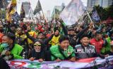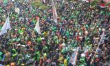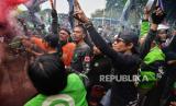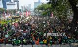 Sejumlah pengemudi ojek online (ojol) melakukan aksi unjuk rasa kawasan Patung Kuda, Jakarta, Kamis (29/8/2024). Mereka menuntut pemerintah dan perusahaan transportasi online untuk melegalkan status profesi driver ojol dalam undang-undang (UU). Selain itu, mereka juga menuntut perusahaan aplikasi untuk menurunkan biaya potongan aplikasi. Mereka datang dengan menggunakan atribut perusahaan masing-masing seperti Gojek, Grab, Shopee, dan Maxim. (FOTO : Republika/Prayogi)