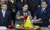 Ketua DPR Puan Maharani (tengah) didampingi Wakil Ketua DPR Rachmat Gobel (kanan) dan Sufmi Dasco Ahmad (kiri) memotong tumpeng usai Rapat Paripurna Khusus HUT DPR ke-79 di Kompleks Parlemen, Senayan, Jakarta, Kamis (29/8/2024). Dalam paripurna tersebut disampaikan juga laporan kinerja DPR tahun 2023-2024. (FOTO : ANTARA FOTO/Dhemas Reviyanto)