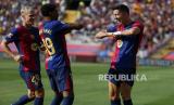 Para pemain Barcelona merayakan gol saat pertandingan antara FC Barcelona dan Valladolid dalam La Liga Spanyol di stadion Olimpiade di Barcelona, ????Spanyol, Sabtu (31/8/2024). Barcelona menundukkan tim tamu Real Valladolid dengan skor 7-0. (FOTO : AP Photo/Joan Monfort)
