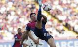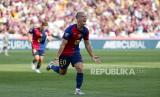 Pemain Barcelona Robert Lewandowski melakukan salto saat pertandingan antara FC Barcelona dan Valladolid dalam La Liga Spanyol di stadion Olimpiade di Barcelona, ????Spanyol, Sabtu (31/8/2024). Barcelona menundukkan tim tamu Real Valladolid dengan skor 7-0. (FOTO : AP Photo/Joan Monfort)