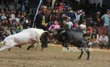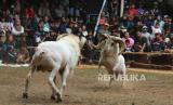 Dua ekor domba garut sedang bertarung saat acara seni ketangkasan domba atau adu domba Wali Kota Bandung Cup 2024 dalam rangka Hari Jadi Kota Bandungari (HJKB) Ke-214, di Lapangan Pamidangan Babakan Siliwangi (Baksil), Kota Bandung, Jawa Barat, Ahad (1/9/2024). Selain menjadi ajang unjuk kebolehan ketangkasan domba Garut sebagai salah satu seni budaya lokal, juga sebagai momen silaturahim Himpunan Peternak Domba dan Kambing Indonesia (HPDKI), serta memberikan kontribusi signifikan terhadap pertumbuhan ekonomi lokal. (FOTO : Edi Yusuf)