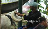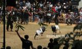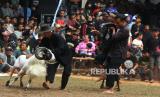 Pemilik domba berupaya memisahkan dombanya saat acara seni ketangkasan domba atau adu domba Wali Kota Bandung Cup 2024 dalam rangka Hari Jadi Kota Bandungari (HJKB) Ke-214, di Lapangan Pamidangan Babakan Siliwangi (Baksil), Kota Bandung, Jawa Barat, Ahad (1/9/2024). Selain menjadi ajang unjuk kebolehan ketangkasan domba Garut sebagai salah satu seni budaya lokal, juga sebagai momen silaturahim Himpunan Peternak Domba dan Kambing Indonesia (HPDKI), serta memberikan kontribusi signifikan terhadap pertumbuhan ekonomi lokal. (FOTO : Edi Yusuf)