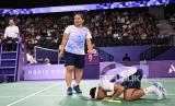 Pebulu tangkis ganda campuran Indonesia Hikmat Ramdani (kanan) bersujud disaksikan rekannya, Leani Ratri Oktila usai menang dalam babak final ganda campuran SL3-SU5 Paralimpiade 2024 Paris di Porte de la Chapelle Arena, Paris, Prancis, Senin (2/9/2024). Hikmaat dan Ratri menang dengan skor 21-16, 21-15 atas lawan senegaranya, Fredy Setiawan dan Khalimatus Sadiyah sekaligus memastikan diri meraih medali emas, sementara Fredy dan Khalimtus meraih medali perak.  (FOTO : ANTARAFOTO/Agung Wahyudi)