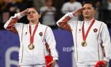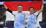 REPUBLIKA.CO.ID, PARIS -- Pebulu tangkis ganda campuran Indonesia Leani Ratri Oktila bersama rekannya, Hikmat Ramdani melakukan penghormatan kepada bendera Merah Putih usai upacara pengalungan medali bulu tangkis ganda campuran SL3-SU5 Paralimpiade 2024 Paris di Porte de la Chapelle Arena, Paris, Prancis, Senin (2/9/2024).