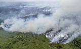 Foto udara api membakar lahan di Desa Rantau Panjang, Muaro Jambi, Jambi, Senin (2/9/2024). Kebakaran yang terjadi sejak Jumat (23/8/2024) dan telah menjalar ke tiga desa meliputi Rantau Panjang, Rondang, dan Londrang dengan menghanguskan 1.000 hektare lebih lahan tersebut telah memasuki hari kesepuluh, sementara upaya pemadaman dari udara dan darat oleh Manggala Agni, BPBD Muaro Jambi, TNI, dan Masyarakat Peduli Api masih terus dilakukan. (FOTO : ANTARA FOTO/Wahdi Septiawan)