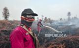 Petugas Manggala Agni Daops Sumatera XI Bukit Tempurung dibantu anggota Masyarakat Peduli Api Desa Catur Rahayu memadamkan kebakaran lahan di perbatasan Muaro Jambi dengan Tanjung Jabung Timur, Rantau Panjang, Muaro Jambi, Jambi, Senin (2/9/2024). Satgas Karhutla setempat menurunkan puluhan personel dari Manggala Agni, TNI, dan Masyarakat Peduli Api Kabupaten Tanjung Jabung Timur guna mengantisipasi perluasan kebakaran yang telah memasuki wilayah perbatasan Kabupaten Muaro Jambi dengan Tanjung Jabung Timur, sementara hingga Senin (2/9/2024) kebakaran yang telah memasuki hari kesepuluh itu masih belum berhasil dipadamkan. (FOTO : ANTARA FOTO/Wahdi Septiawan)
