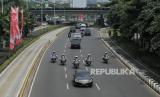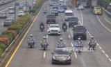 Iring-iringan rombongan kendaraan yang membawa Pemimpin Tertinggi Gereja Katolik Paus Fransiskus melintas di Tol Dalam Kota Gatot Subroto, Jakarta, Rabu (3/9/2024). Pemimpin Tertinggi Gereja Katolik Paus Fransiskus tersebut mengadakan perjalanan apostolik ke Indonesia, Papua Nugini, Timor Leste, dan Singapura pada 2 hingga 13 September 2024. Indonesia akan menjadi negara pertama yang dikunjungi Paus Fransiskus dalam rangkaian perjalanannya ke Asia dan Pasifik ini, pada 3 hingga 6 September 2024. (FOTO : Republika/Prayogi)