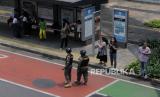 Warga menunggu Iring-iringan kendaraan yang membawa Paus Fransiskus saat tiba di Jakarta melewati Jalan Sudirman, Jakarta, Selasa (3/8/2024). (FOTO : Republika/Thoudy Badai)