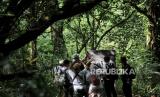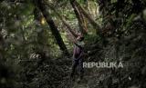 Petugas mengamati area habitat Owa Jawa (Hylobates moloch) yang berada di kawasan hutan lindung Malabar, pegunungan Puntang, Kabupaten Bandung, Jawa Barat, Jumat (30/8/2024). Pertamina Hulu Energi (PHE) melalui PEP Subang Field Regional Jawa sebagai Subholding Upstream Pertamina berkolaborasi dengan Yayasan Owa Jawa melakukan monitoring perilaku Owa Jawa yang telah dilepasliarkan di kawasan hutan lindung Malabar. Pengamatan tersebut dilakukan dari jarak yang aman yakni 15-20 meter dari habitat aslinya di Gunung Puntang. Kegiatan tersebut merupakan program kolaborasi antara PHE bersama Yayasan Owa Jawa sebagai upaya penyelamatan primata langka di Gunung Puntang yang termasuk dalam program pelestarian keanekaragaman hayati. (FOTO : Republika/Thoudy Badai)