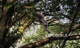 Seekor Owa Jawa (Hylobates moloch) bergelantungan di dahan pohon di kawasan hutan lindung Malabar, pegunungan Puntang, Kabupaten Bandung, Jawa Barat, Jumat (30/8/2024). Pertamina Hulu Energi (PHE) melalui PEP Subang Field Regional Jawa sebagai Subholding Upstream Pertamina berkolaborasi dengan Yayasan Owa Jawa melakukan monitoring perilaku Owa Jawa yang telah dilepasliarkan di kawasan hutan lindung Malabar. Pengamatan tersebut dilakukan dari jarak yang aman yakni 15-20 meter dari habitat aslinya di Gunung Puntang. Kegiatan tersebut merupakan program kolaborasi antara PHE bersama Yayasan Owa Jawa sebagai upaya penyelamatan primata langka di Gunung Puntang yang termasuk dalam program pelestarian keanekaragaman hayati. (FOTO : Republika/Thoudy Badai)