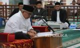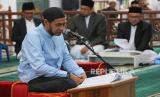 Bakal calon Gubernur Aceh Muzakir Manaf mengikuti uji mampu baca Al-quran pada tahapan pemilihan kepala daerah di Masjid Raya Baiturrahman, Banda Aceh, Rabu (4/9/2024). Komisi Independen Pemilihan (KIP) Provinsi Aceh melaksanakan uji mampu baca Al-quran kepada pasangan bakal calon Gubernur dan Wakil Gubernur Aceh Muzakir Manaf/Fadhlullah dan pasangan Bustami Hamzah/Tengku Muhammad Yusuf A Wahab sebagai syarat wajib bagi setiap bakal calon kepala daerah di Aceh yang diatur dalam Undang Undang Pemerintahan Aceh (UUPA) dan Qanun (peraturan daerah) Nomor 12 tahun 2016. (FOTO : ANTARA FOTO/Ampelsa)
