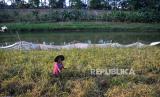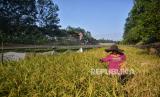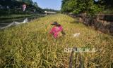 Epon Sukarsi (54) memanen padi yang ditanam di lahan kosong kawasan pinggiran Kanal Banjir Timur (KBT) , Duren Sawit, Jakarta, Rabu (4/9/2024).Epon Sukarsi bersama suami manfaatkan lahan kosong di pinggiran KBT untuk mananam padi sejak bulan Mei lalu. Kini padi yang ditanam dilahan sepanjang 70 meter itu telah memasuki masa panen. Panen ini merupakan panen perdana dan rencananya padi hasil panen tersebut sebagian akan dikonsumsi dan sebagian dijual untuk modal tanam kembali. (FOTO : Republika/Prayogi)
