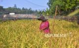 Epon Sukarsi bersama suami manfaatkan lahan kosong di pinggiran KBT untuk mananam padi sejak bulan Mei lalu. Kini padi yang ditanam dilahan sepanjang 70 meter itu telah memasuki masa panen.
