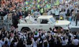Pemimpin Gereja Katolik Dunia Paus Fransiskus menyapa umat Katolik yang menghadiri misa akbar menggunakan popemobile di Stadion Madya, kompleks Gelora Bung Karno (GBK) Jakarta, Kamis (5/9/2024). Misa akbar yang dihadiri oleh hampir 90 ribu umat Katolik tersebut akan dipimpin langsung oleh Pemimpin Gereja Katolik Dunia yang juga Kepala Negara Vatikan Paus Fransiskus yang berlangsung pukul 17.00 -19.00 WIB. Paus Fransiskus melakukan perjalanan keagamaan dan kenegaraan atau apostolik ke Indonesia selama 4 hari dari tanggal 3-6 September mendatang. Indonesia merupakan negara pertama yang akan dikunjungi Paus Fransiskus selama perjalanan apostoliknya selama 11 hari di kawasan Asia Pasifik. (FOTO : Republika/Thoudy Badai)