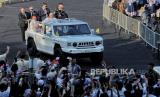 REPUBLIKA.CO.ID, JAKARTA -- Pemimpin Gereja Katolik Dunia Paus Fransiskus menyapa umat Katolik yang menghadiri misa akbar menggunakan popemobile di Stadion Madya, kompleks Gelora Bung Karno (GBK) Jakarta, Kamis (5/9/2024).