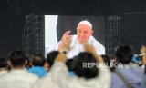 Umat Katolik mengikuti misa akbar di Stadion Madya, kompleks Gelora Bung Karno (GBK) Jakarta, Kamis (5/9/2024). Misa akbar yang dihadiri oleh hampir 90 ribu umat Katolik tersebut dipimpin langsung oleh Pemimpin Gereja Katolik Dunia yang juga Kepala Negara Vatikan Paus Fransiskus yang berlangsung pukul 17.00 -19.00 WIB. Paus Fransiskus melakukan perjalanan keagamaan dan kenegaraan atau apostolik ke Indonesia selama 4 hari dari tanggal 3-6 September mendatang. Indonesia merupakan negara pertama yang dikunjungi Paus Fransiskus selama perjalanan apostoliknya 11 hari di kawasan Asia Pasifik. (FOTO : Republika/Thoudy Badai)