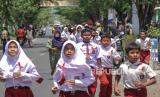 Sejumlah siswa sekolah dasar mengikuti simulasi penanganan darurat potensi megatrust di Kelurahan Tegalkamulyan, Cilacap, Jawa Tengah, Kamis (5/9/2024). Badan Nasional Penanggulangan Bencana (BNPB) menggelar apel kesiapsiagaan dan simulasi mandiri potensi bencana megatrust di empat titik, yakni Pangandaran, Cilacap, Pandeglang, dan Kabupaten Kepulauan Mentawai, Provinsi Sumbar yang dilatarbelakangi prediksi oleh para ilmuan dan Badan Meteorologi Klimatologi dan Geofisika (BMKG) adanya potensi gempa bumi serta tsunami dalam skala megathrust. (FOTO : ANTARA FOTO/Idhad Zakaria)