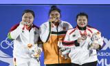 Lifter Kalimantan Timur Firda Khairunnisa (tengah), lifter Riau Maharani (kiri), dan lifter Jawa Tengah Ayunda Risma (kanan) berfoto bersama usai bertanding dalam kelas 87 kg putri PON XXI Aceh-Sumut 2024 di GOR Seuramoe Angkat Besi Harapan Bangsa, Banda Aceh, Aceh, Ahad (8/9/2024). Firda Khairunnisa berhasil meraih medali emas sekaligus memecahkan rekor PON untuk total angkatan 212 kg dan rekor nasional untuk clean and jerk dengan angkatan 119 kg sedangkan medali perak diraih lifter Riau Maharani dengan total angkatan 191 kg dan medali perunggu diraih lifter Jawa Tengah Ayunda Risma dengan total angkatan 187 kg. (FOTO : ANTARA FOTO/Aprillio Akbar)
