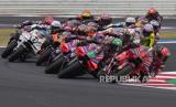 Pembalap memacu motornya pada ajang MotoGP 2024 San Marino di sirkuit Misano di Misano Adriatico, Italia, Ahad (8/9/2024). Pembalap Gresini Marc Marquez berhasil menjuarai balapan MotoGP San Marino 2024 dengan catatan waktu 41 menit 52,083 detik, mengungguli dua pembalap Ducati Lenovo Team Francesco Bagnaia dan Enea Bastianini. Ini adalah kemenangan kedua Marquez di ajang MotoGP 2024. (FOTO : AP Photo/Antonio Calanni)