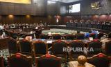 REPUBLIKA.CO.ID, JAKARTA -- Suasana jalannya sidang putusan tentang gugatan syarat usia calon pimpinan KPK di Gedung Mahkamah Konstitusi, Jakarta, Kamis (12/9/2024).