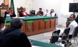 Terdakwa I Nyoman Sukena (kanan) yang didakwa melakukan tindak pidana karena memelihara landak Jawa (Hysterix javanica) menjalani persidangan di Pengadilan Negeri Denpasar, Bali, Kamis (12/9/2024). Dalam sidang dengan agenda pemeriksaan terdakwa tersebut majelis hakim mengabulkan permohonan penangguhan penahanan I Nyoman Sukena yang dialihkan dari tahanan rutan menjadi tahanan rumah. (FOTO : ANTARA FOTO/Fikri Yusuf)