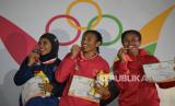 Atlet lompat jauh Bali Maria Londa (tengah), atlet NTB Rohani (kiri), atlet Papua Visensia Amjara (kanan) berpose usai upacara penghormatan pemenang final lompat jauh putri PON XXI Aceh-Sumut 2024 di Stadion Madya Atletik Sumut Sport Center, Deli Serdang, Sumatera Utara, Kamis (12/9/2024). Medali emas lompat jauh putri diraih Maria Londa dengan lompatan sejauh 6,44 meter, medali perak diraih atlet NTB Rohani dengan lompatan sejauh 6,14 meter, dan medali perunggu diraih atlet Papua Vinsensia Amjara dengan lompatan sejauh 6,06 meter. (FOTO : ANTARA FOTO/Fauzan)