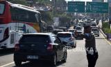 Anggota Satlantas Polres Bogor mengatur arus lalu lintas saat pemberlakuan satu arah menuju jalur wisata Puncak di Simpang Gadog, Kabupaten Bogor, Jawa Barat, Ahad (15/9/2024). Satlantas Polres Bogor mencatat peningkatan volume kendaraan di jalur wisata Puncak, Bogor tersebut mencapai 18.200 kendaraan hingga pukul 08.00 WIB pada libur panjang akhir pekan yang bertepatan dengan libur peringatan Maulid Nabi Muhammad SAW. (FOTO : ANTARA FOTO/Arif Firmansyah)