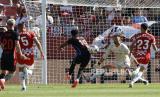 Pemain Barcelona Pedri mencetak gol saat pertandingan antara Girona dan Barcelona sepak bola La Liga Spanyol di stadion Montilivi di Girona, Spanyol, Ahad (15/9/2024). Barcelona berhasil meraih kemenangan 4-1 atas Girona. (FOTO : AP Photo/Joan Monfort)