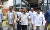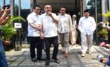 Pasangan bakal calon gubernur dan wakil gubernur DKI Jakarta Ridwan Kamil (kiri) dan Suswono (kanan) bersama Ketua Harian DPP Partai Gerindra Sufmi Dasco Ahmad (tengah) didampingi Ketua Tim Pemenangan Riza Patria (kedua kiri) berjalan bersama saat akan menggelar pertemuan di Hutan Kota Plataran, Senayan, Jakarta, Senin (16/9/2024). Pertemuan tersebut merupakan rapat perdana pasangan bacagub dan bacawagub dengan tim pemenangan dari semua perwakilan partai pendukung. (FOTO : ANTARA FOTO/Indrianto Eko Suwarso)