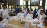 REPUBLIKA.CO.ID, JAKARTA Pasangan bakal calon gubernur dan wakil gubernur DKI Jakarta Ridwan Kamil dan Suswono bersama Ketua Harian DPP Partai Gerindra Sufmi Dasco Ahmad didampingi Ketua Tim Pemenangan Riza Patria menggelar pertemuan di Hutan Kota Plataran, Senayan, Jakarta, Senin (16/9/2024).