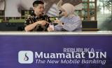 Sekretaris Perusahaan PT Bank Muamalat Indonesia Tbk Hayunaji (kiri) menjelaskan kepada nasabah cara isi ulang (top up) kartu Flazz BCA menggunakan Muamalat DIN di Jakarta, Selasa (17/9/2024). Bank Muamalat menggandeng ALTO Network (ALTO) untuk mempermudah nasabahnya dalam melakukan top up kartu Flazz BCA di aplikasi Muamalat DIN di mana saja dan kapan saja. Dengan jumlah pengguna Muamalat DIN yang telah menembus angka lebih dari setengah juta, terobosan ini diharapkan dapat terus meningkatkan loyalitas penggunanya sekaligus memperkuat upaya Bank Muamalat dalam modernisasi layanan keuangan berbasis syariah. (FOTO : Dok Republika)
