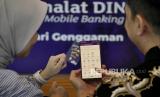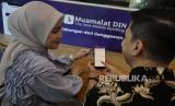 Nasabah melakukan isi ulang (top up) kartu Flazz BCA menggunakan Muamalat DIN di Jakarta, Selasa (17/9/2024). Bank Muamalat menggandeng ALTO Network (ALTO) untuk mempermudah nasabahnya dalam melakukan top up kartu Flazz BCA di aplikasi Muamalat DIN di mana saja dan kapan saja. Dengan jumlah pengguna Muamalat DIN yang telah menembus angka lebih dari setengah juta, terobosan ini diharapkan dapat terus meningkatkan loyalitas penggunanya sekaligus memperkuat upaya Bank Muamalat dalam modernisasi layanan keuangan berbasis syariah. (FOTO : Dok Republika)